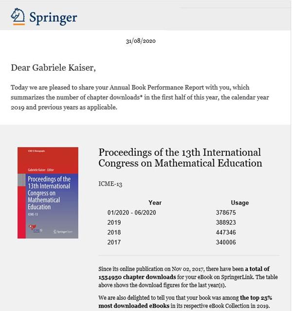 According to a report of the scientific Springer publishing house, dated 29.2.2020, the "Compendium for Early Career Researchers in Mathematics Education" published by Gabriele Kaiser and Norma Presmeg achieved the highest number of downloads in 2019 and with 102,615 downloads ranks fourth in the entire publishing group.