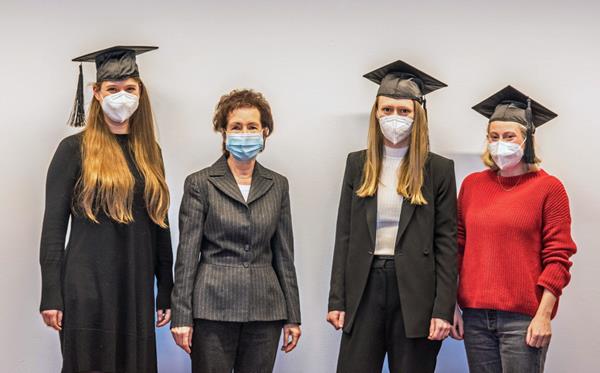 Unfortunately, due to corona protection measures masks still necessary in 2021: Prof. Dr. Gabriele Kaiser as "doctoral mother" hands over the doctoral hats to Lisa Wendt ( 1st from left ), Ann Sophie Stuhlmann ( 2nd from right ) and Anna Orschulik ( right ) after passing the disputation this year.